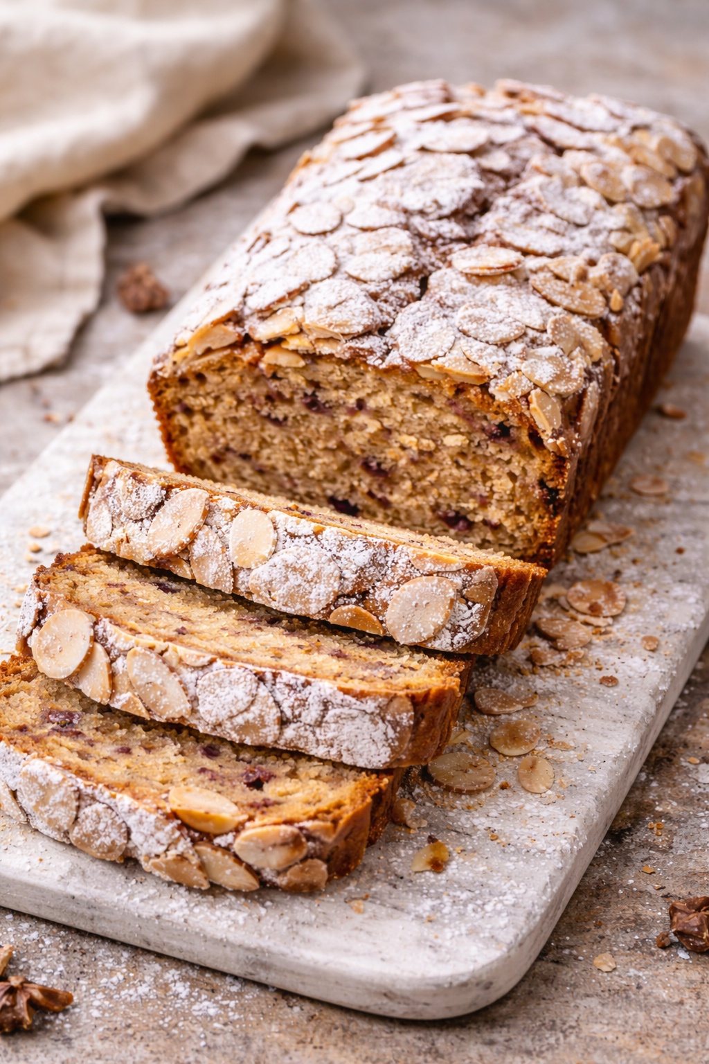 A rich almond loaf inspired by the filling of a classic almond croissant, blended with the softness of banana bread and finished with toasted flaked almonds.