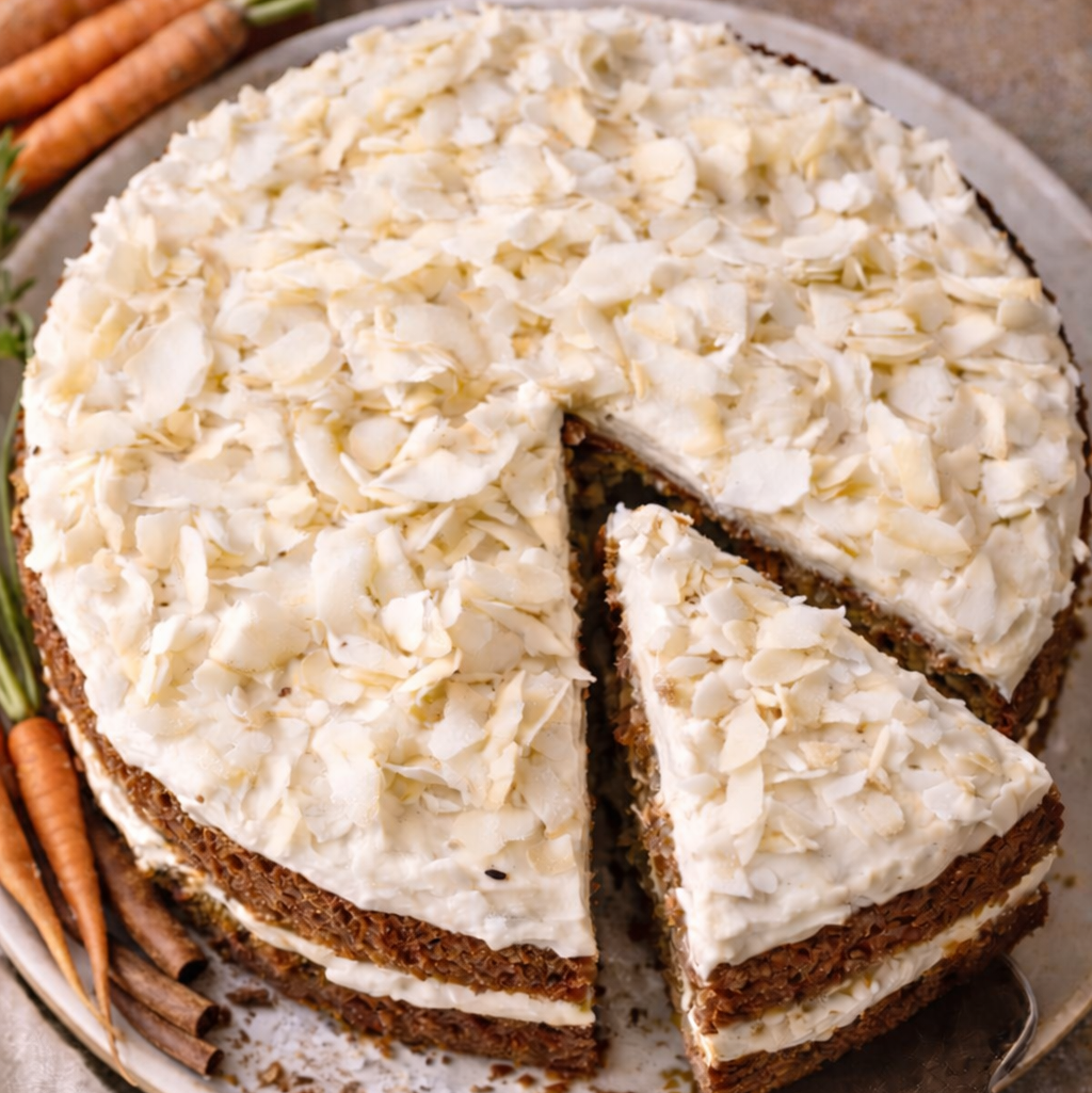 A clean take on classic carrot cake made with olive oil for a rich, tender crumb and finished with a light shredded coconut topping.